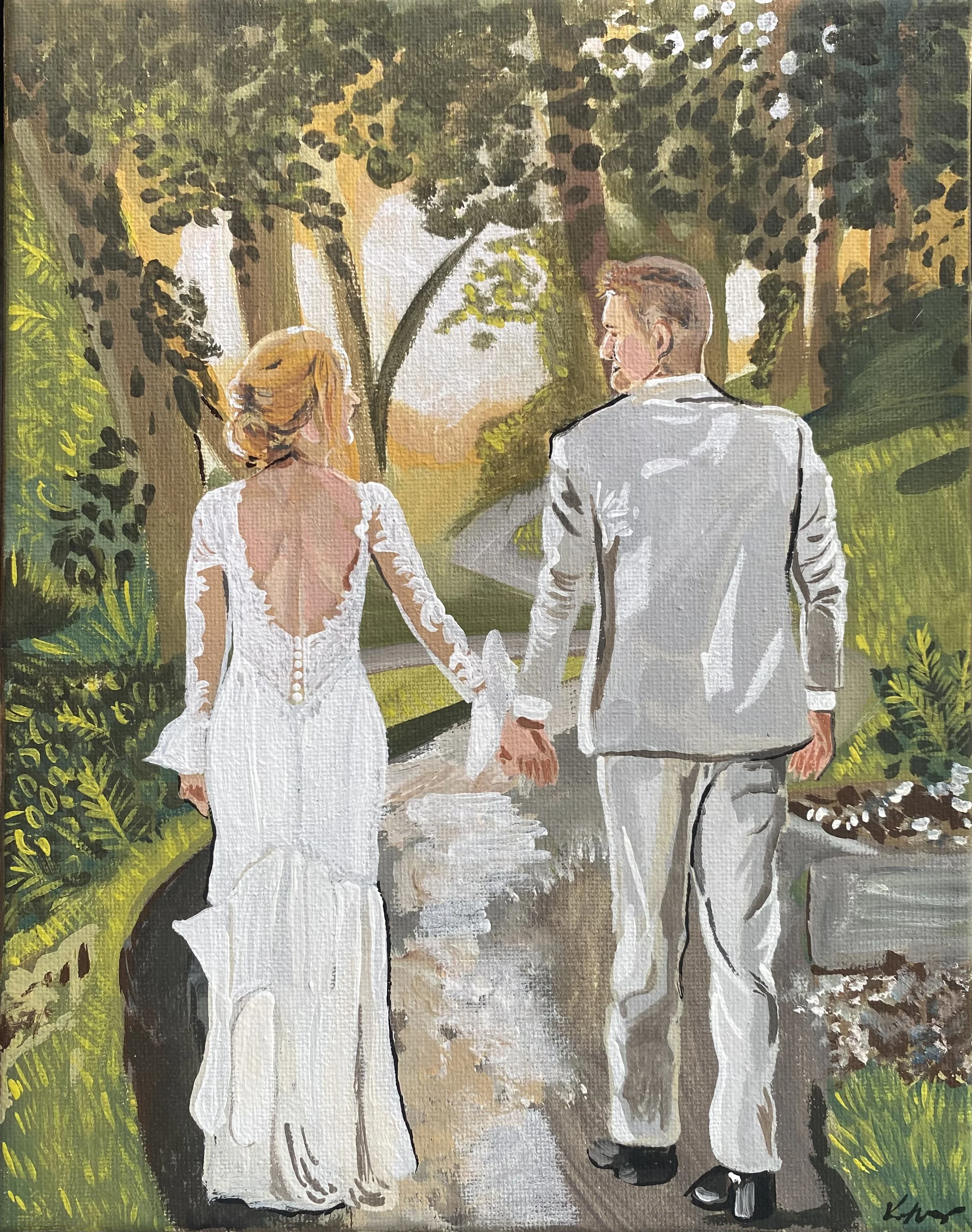 Live Wedding Paintings begin with planning down to the very details of what you envision your painting to be on your special day. My style of painting includes a touch of whimsical and abstract aesthetic that will encapsulate the beautiful scenery and the love you have for one another within your portraits. Paintings are done using acrylic paints on a premium canvas. I will be there to set up and paint between 6 & 8 hours (or unless specified otherwise). Paintings will then be taken home for finishing details to be added and then shipped directly to you within two weeks of your wedding date.