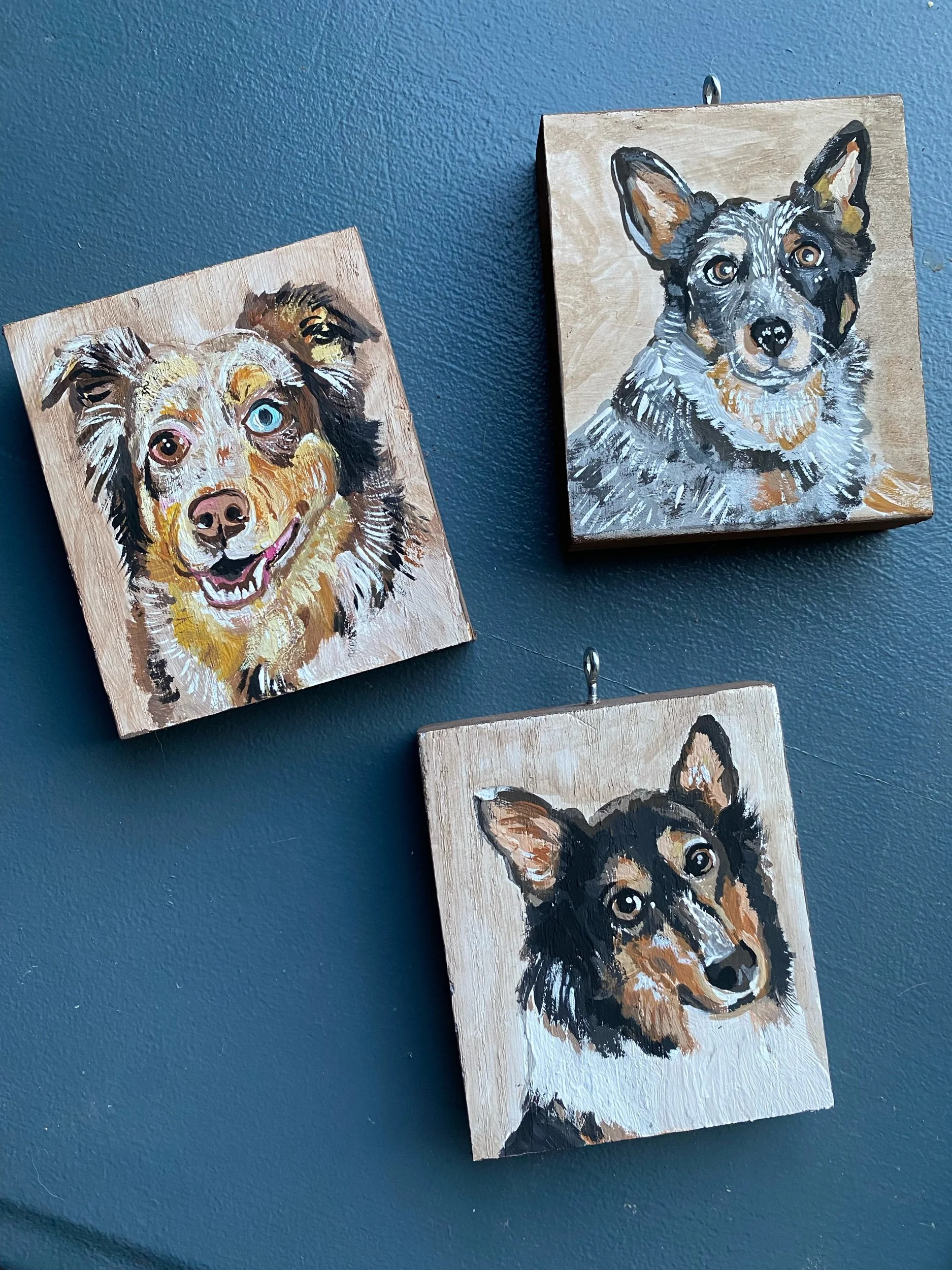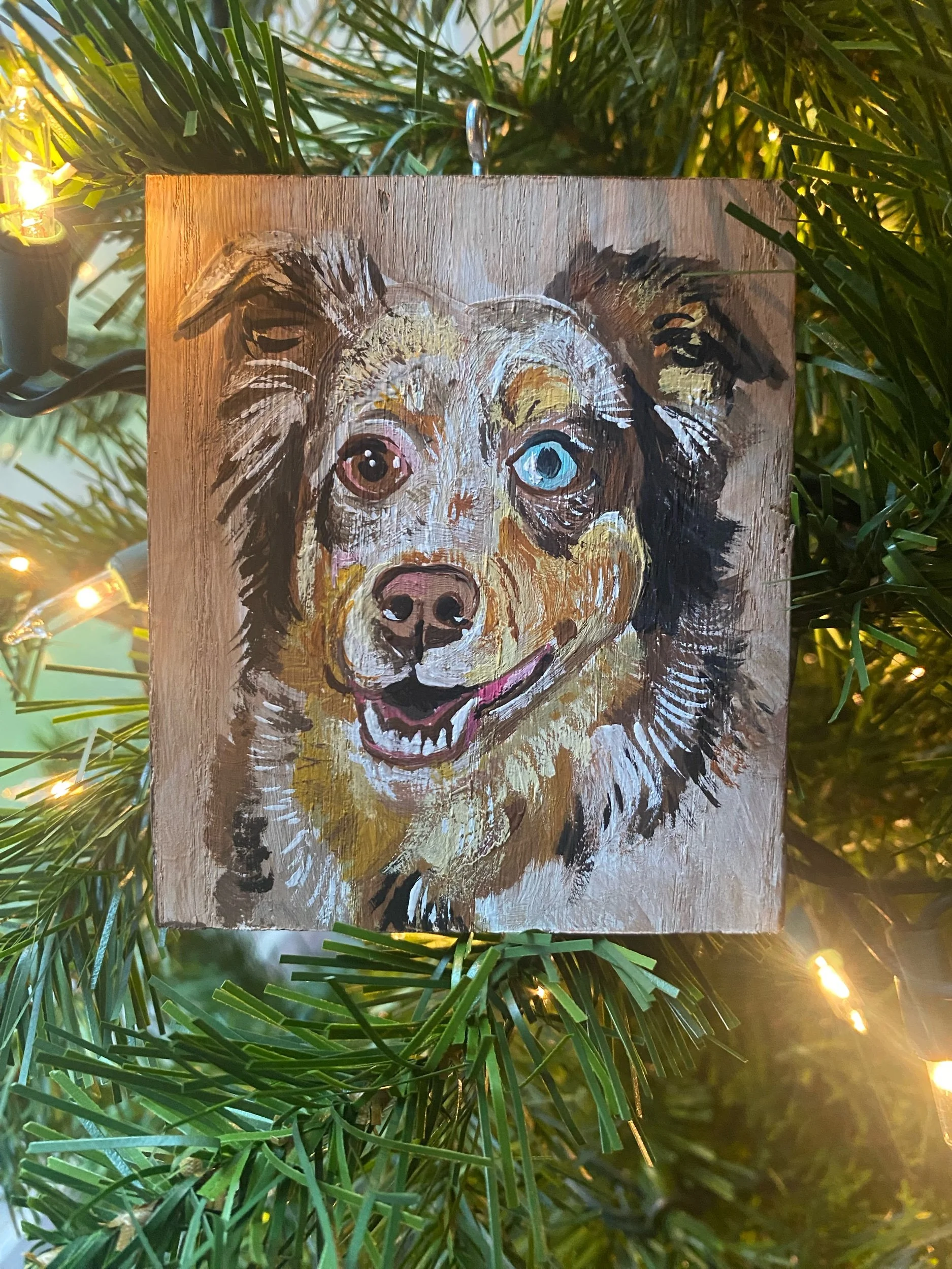 Gift yourself or a loved one a custom wooden, hand painted pet ornament! These are a perfect gift to give. Choose round or square - each size is approximately 3.5’’. Please send dog pictures to pennypeonydesigns@gmail.com